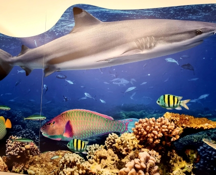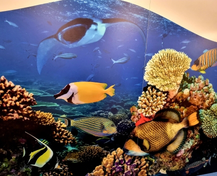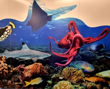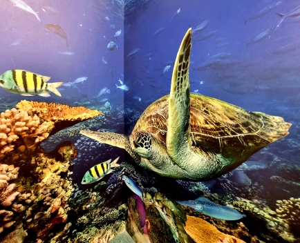 Cel puțin 10 metri sub apă. Aici recifurile de corali prosperă, pești colorați înoată în jur, iar un rechin imens e pe poziții de vânătoare. Aici veți întâlni o broască țestoasă de apă, o caracatiță luminoasă și o raie misterioasă. Peștii mici și mari de la malul Mării Negre și lacurile din România și Moldova se adună aici de asemenea. Lumea subacvatică este o minune!