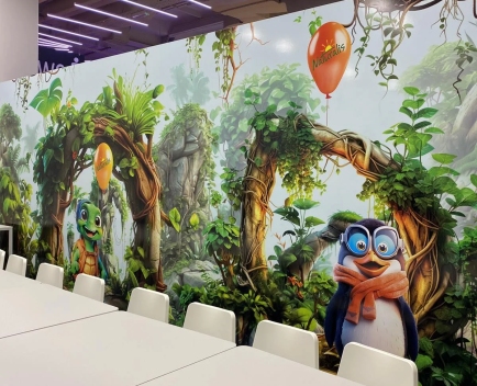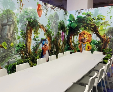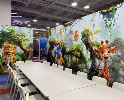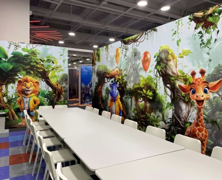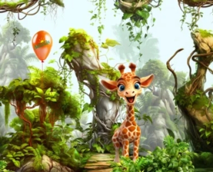 Pe măsură ce explorați camera, veți zări o girafă mică care se ascunde printre frunzele junglei. Poate fi mică, dar este mare la distracție și adoră să se joacede-a v-ati ascunselea cu copiii. Și în cele din urmă, regele junglei, un leu măreț, a venit să se alăture petrecerii! El este regal și puternic, dar este și prietenos și nu poate rezista unei guri de suc NATURALIS răcoritor.