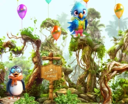 Nu uitați să salutați papagalul zgomotos așezat în vârf. El va adăuga o notă tropicală aventurii voastre în junglă cu penele lui colorate și ciripituri vesele. El se va bucura să vă vadă și pe voi și prietenii voștri bucurându-vă de sucurile NATURALIS în timp ce dansați și jucați.